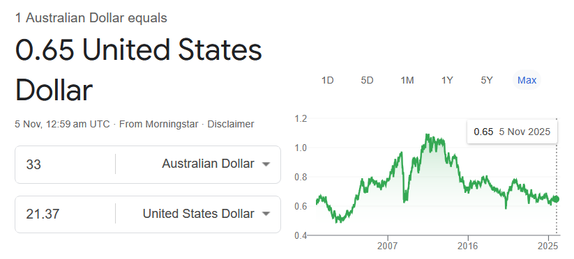 As of November 2025, $33 Aussie dollars is equal to about $22 USD | £16 GBP | €19 Euro